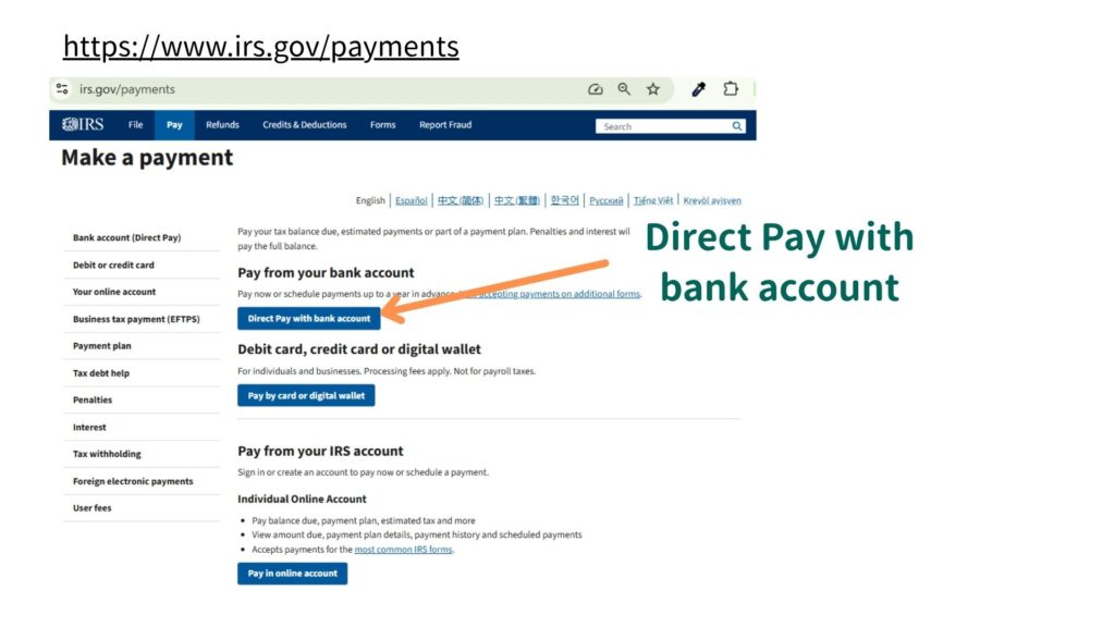 IRSの公式サイト(irs.gov/payments)から直接銀行口座を使って支払う方法です。手数料はかかりません。支払いの記録も残るので安心です。