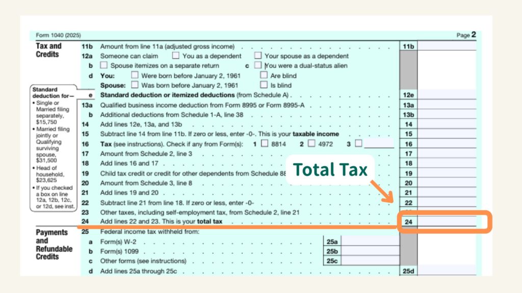 • 前年度の確定申告「Form 1040」Total Tax(2ページ目、24番)に記載された金額を4分割にしてQ1~Q4にそれぞれ支払います。